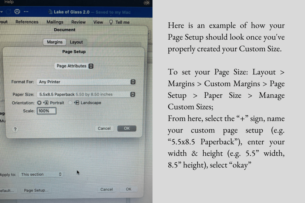 - In Microsoft Word: Layout > Margins > Custom Margins > Page Setup > Paper Size > Manage Custom Sizes; From here, select the “+” sign, name your custom page setup (e.g. “5.5×8.5 Paperback”), enter your width & height (e.g. 5.5” width, 8.5” height), select “okay”