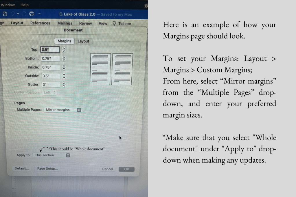 - In Microsoft Word: Layout > Margins > Custom Margins; From here, select “Mirror margins” from the “Multiple Pages” drop-down, and enter your preferred margin sizes.